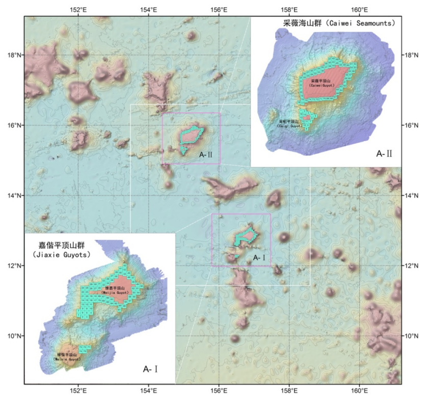 合同区简介:中国大洋矿产资源研究开发协会富钴结壳合同区位于西太平洋海山区,面积共3000km²,共2个勘探区块,矿区位置在经度154°E ~ 158°E和纬度12°N ~ 17°N之间。