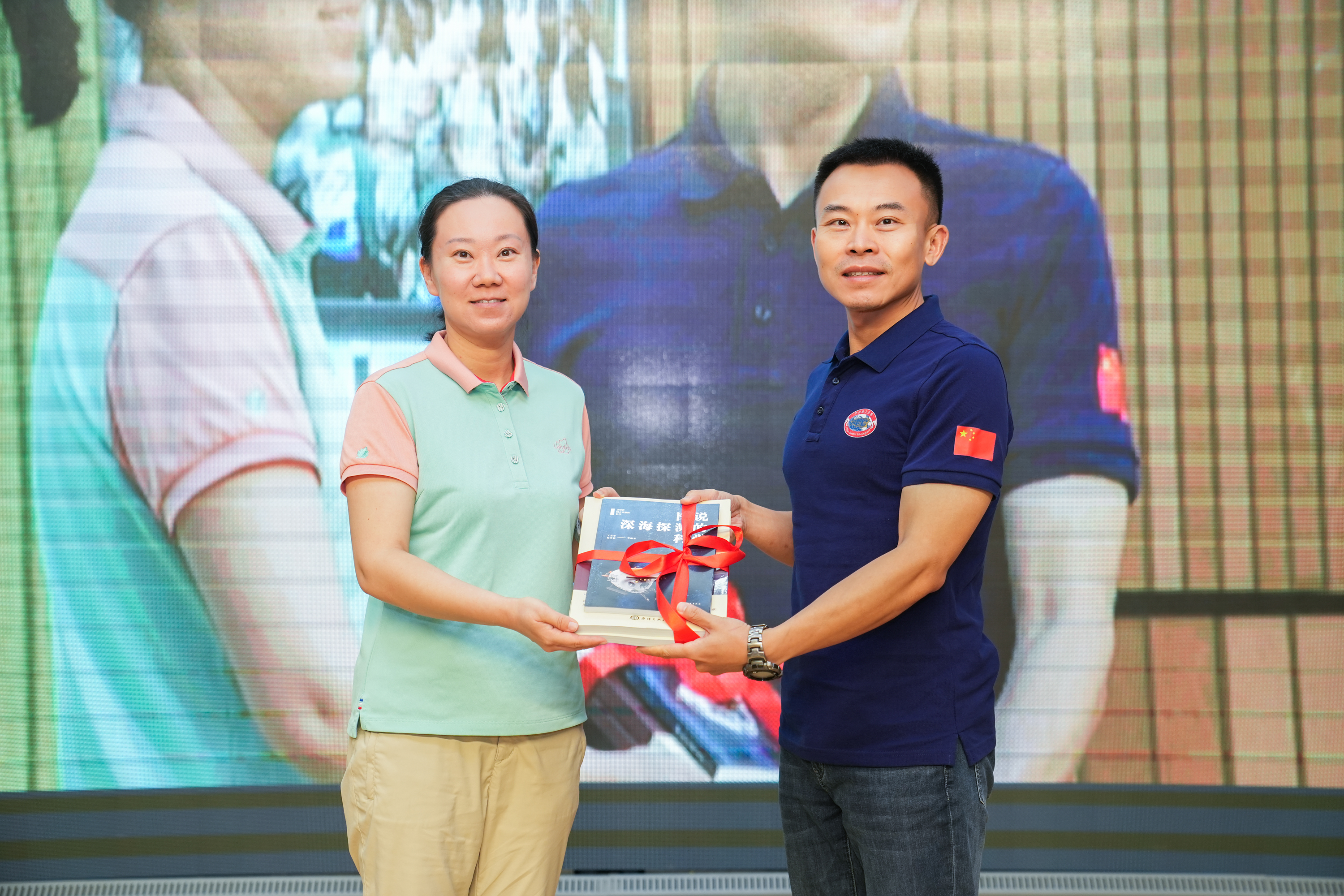 活动中,中国大洋事务管理局向北京一零一中学赠送“蛟龙号”模型,“蛟龙号”潜航员唐嘉陵向北京一零一中学赠送深海科普图书。