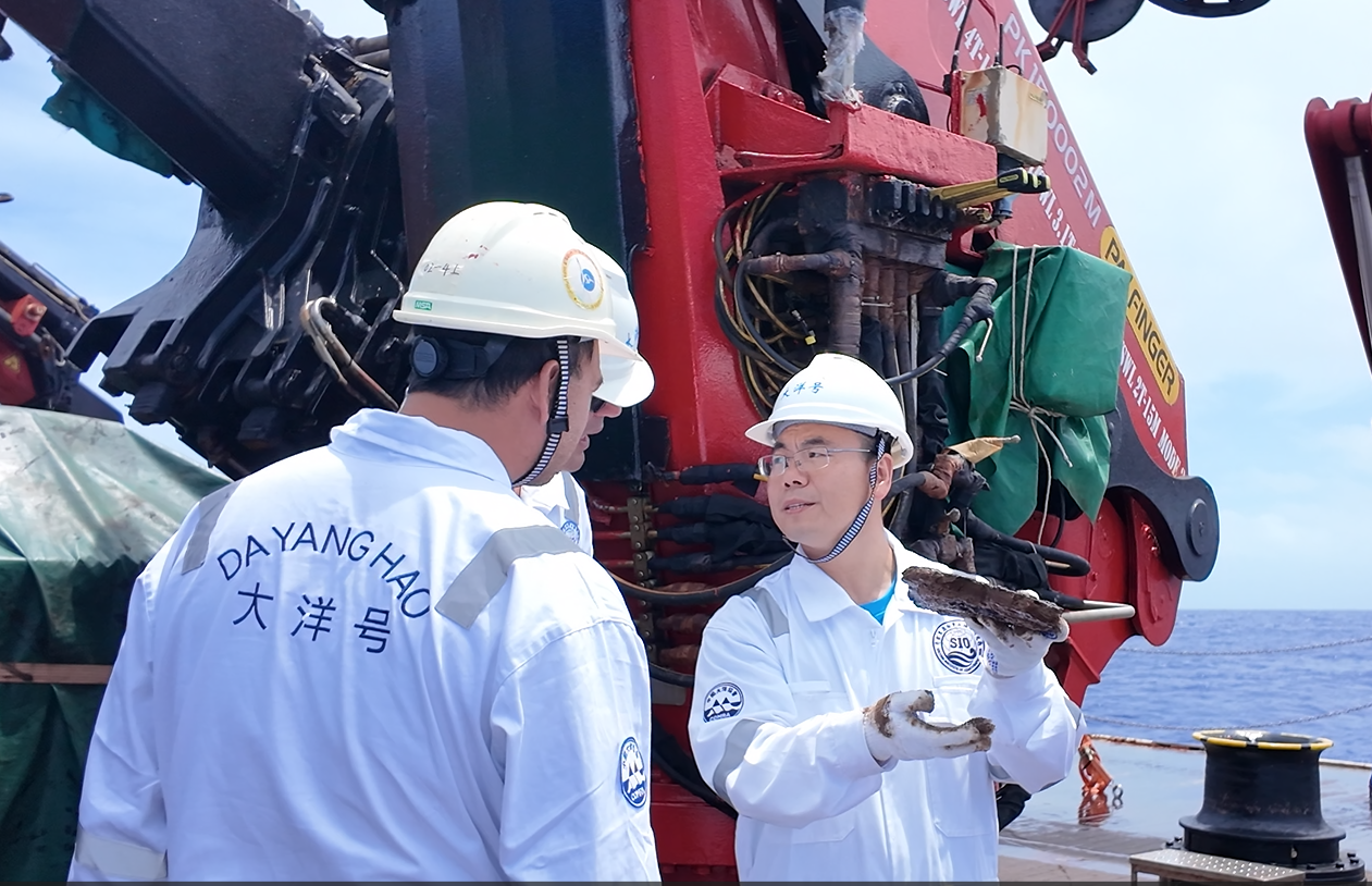 航次首席李小虎为库方介绍获取的结壳样品(央广网发 自然资源部供图)